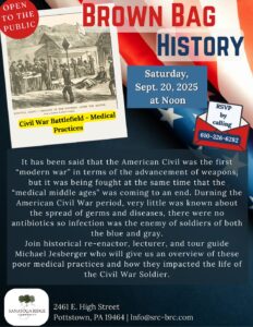 « All Events This event has passed. Brown Bag History – Civil War Battlefield Medical Practices September 20, 2025 @ 12:00 PM - 1:00 PM « American Red Cross Blood Drive – 2025 Sanatoga Ridge Community Yard Sale » Add to calendar Google Calendar iCalendar Outlook 365 Outlook Live Details Date: September 20, 2025 Time: 12:00 PM - 1:00 PM Venue Sanatoga Ridge Community 2461 E. High Street Pottstown, PA 19464 + Google Map Phone 610-326-6282 View Venue Website Organizer Sanatoga Ridge Community Phone 610-326-6282 View Organizer Website